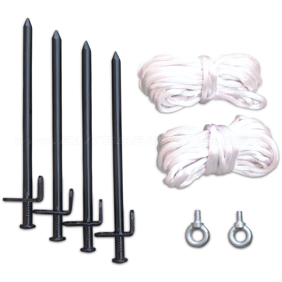 - Features a fully tensioned, snap button frame that ensures a flat projection. Includes: single-piece aluminum frame with detachable legs, screen material, carrying bag, ground stakes, rigging cord, and support rings.