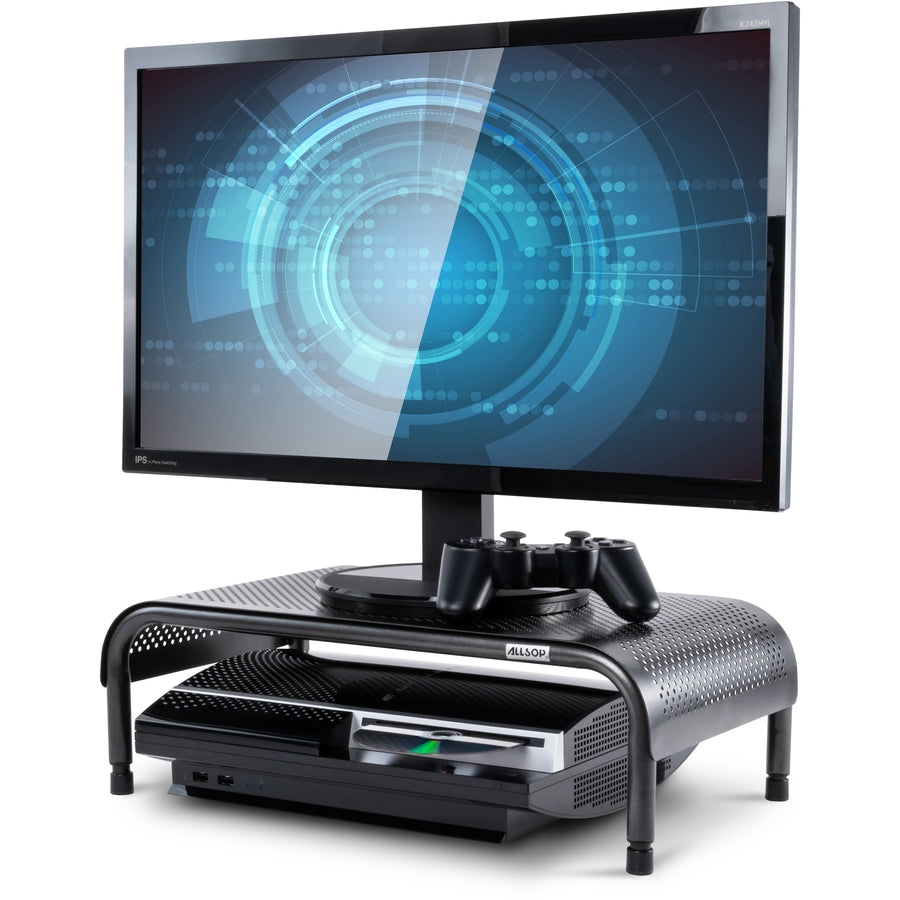 Metal Art Ergo 3 Adjustable Monitor Stand offers you the ability to choose from three heights to optimize the monitor or TV placement. Using a simple pushpin system with three settings, you can easily raise your monitor 6" , 7" or 8" off your desk for a comfortable, ergonomic viewing experience. Raised height provides a handy organizational area underneath to store your notebook, keyboard, desk supplies and more. Durable, metal construction is finished with a tough, powder coating to resist showing scratches. Perforated holes allow air to flow freely, keeping your electronics cool. Stand is designed to hold monitors or TVs up to 35 lb.