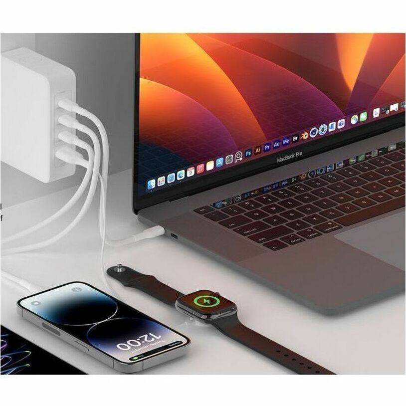 Charge a MacBook Pro at full speed or fast charge an iPhone and iPad while charging two additional devices at the same time with our 140W 4-Port GaN Charger. This powerful GaN charger offers easy access to its 3x USB-C and 1x USB-A ports. It supports a wide range of devices including MacBook, iPhone, iPad, and Apple Watch, as well as other USB-C smartphones, tablets, and laptops.