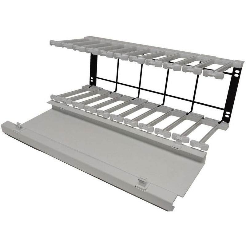 Horizontal cable managers are available in 2RU and 4RU sizes. Fingers begin 3/4 in from the face of rack to provide bend limitation for cables, protecting cables, equipment and network performance. Included hinged cover mounts with six heavy duty clips allow them to be