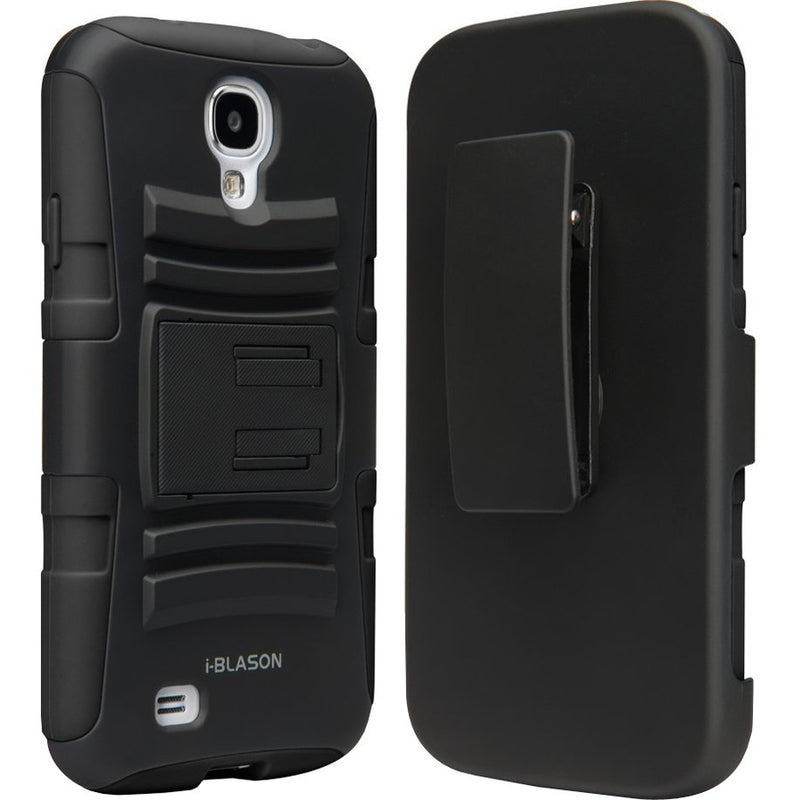 Slip your Galaxy S4 into this signature custom fit dual layer kickstand case with a belt clip holster by i-Blason (TM) and experience the peace of mind of knowing your investment is well protected. Flexible, yet stronger. The inner layer of silicone case offers excellent shock absorption and abrasion resistance while maintaining a thin form factor. During the same time a reinforcing hard shell layer clips the phone and silicone case together with a snug fit. A innovative built-in stand provides ultimate flexibility and convenience allowing you to watch videos and movies with enviable comfort. The raised wrap-around edges make for a "lay-on-the-table" design that helps protect the glass screen from damage. Holster shell is very easy to install and remove, and definitely affordable. The belt clip can rotate 180 degrees to provide you with flexibility you would never imagine--why not build a changeable wardrobe for your phone?