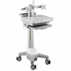 This model is designed to display two screens with separate arms which can support monitors, tablets, and all-in-one PC's. Individuals are able to adjust the height of the cart to a desirable position as well as adjust the screen to share your display with others. Additional storage is provided under the desk surface for smaller CPU units and additional attachments are provided for larger CPU units to be added onto the backside of the cart. A built-in fan is included under the desk surface providing ventilation to any CPU units kept inside the desk. A Keyboard tray, mouse tray, scanner holder, and smart wheel locks are also included. The large wheels at the bottom of the cart allow for easy cart movement and use push lock technology that lock with one push and unlock with another. Additional bins can be added such as garbage pails, storage bins, and medicine drawers.