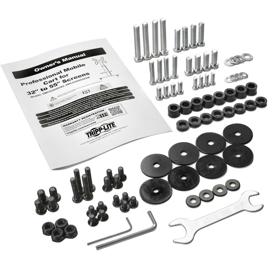 The height-adjustable TV floor stand fits most displays, whiteboards and monitors from 32 to 55 inches. Its durable frame withstands the stress of repeated adjustments and supports up to 130 pounds (59 kgs.) You can raise or lower the height of the display from 50 to 62 inches above the floor. You can also tilt the screen up to 45 degrees to achieve the most comfortable viewing angle.