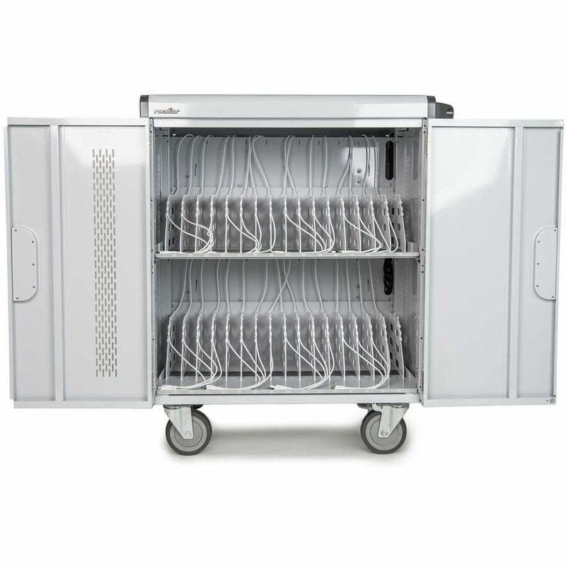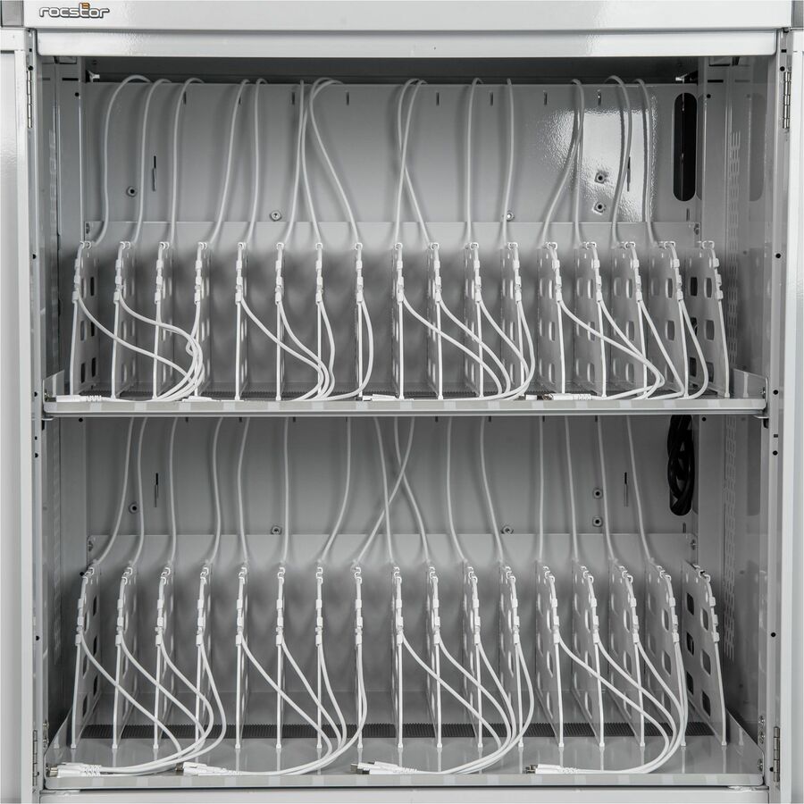 The Rocstor Volt V32 Charging Cart is a premier PRE-WIRED ready to use solution for managing and charging up to 32 devices, including certain Apple MacBook Air, MacBook Pro models, Chromebooks, and notebooks. Combining rugged construction with advanced features, the Volt V32 is crafted for efficiency and reliability in a variety of settings such as educational institutions, government offices, and healthcare facilities. Its Smart Charging Technology ensures optimal power distribution, enabling each device to charge as quickly and safely as possible, with power delivery at maximum 80W per device. The cart's sturdy steel design, with secure locking mechanisms and ample storage compartments, provides both durability and peace of mind.