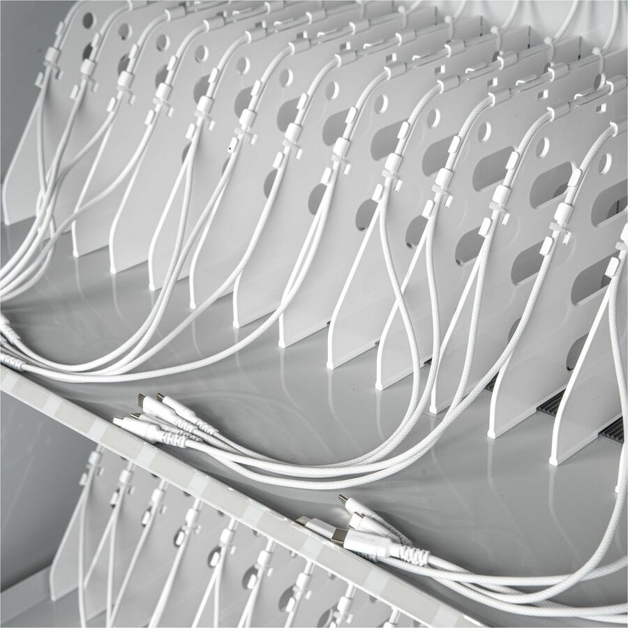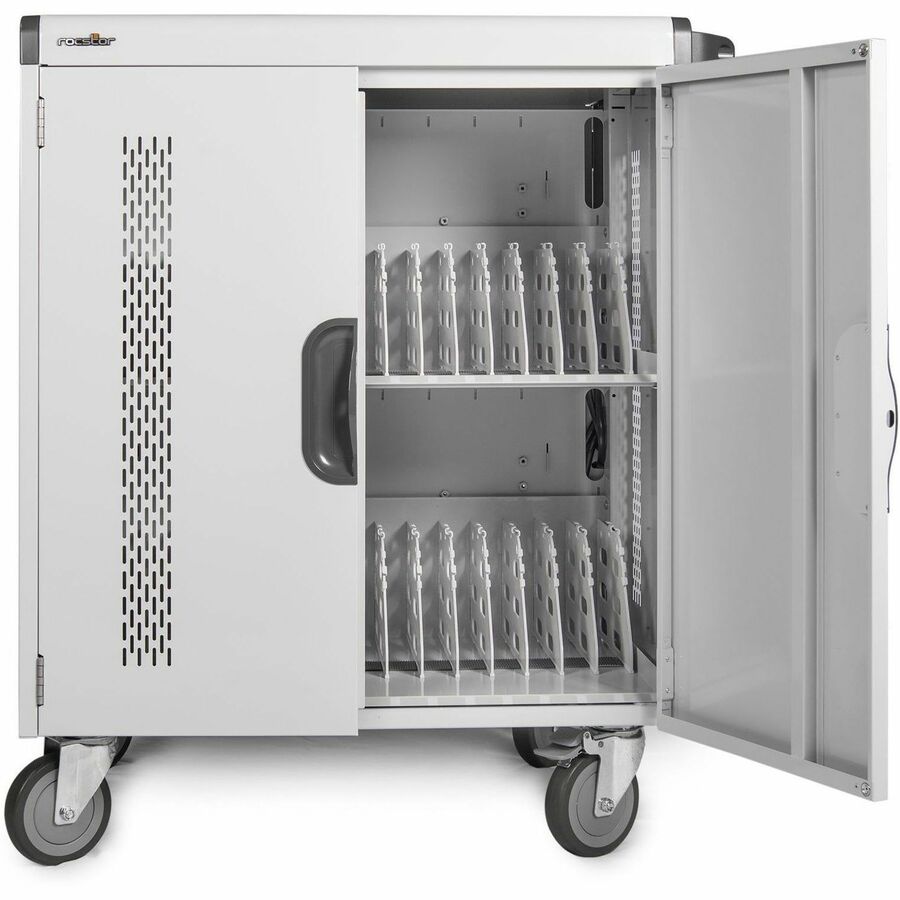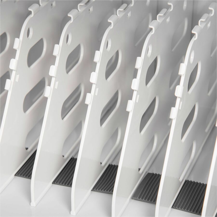 Storage: Three fixed shelves with 32 smooth-edged compartments for easy device loading and unloading. -
