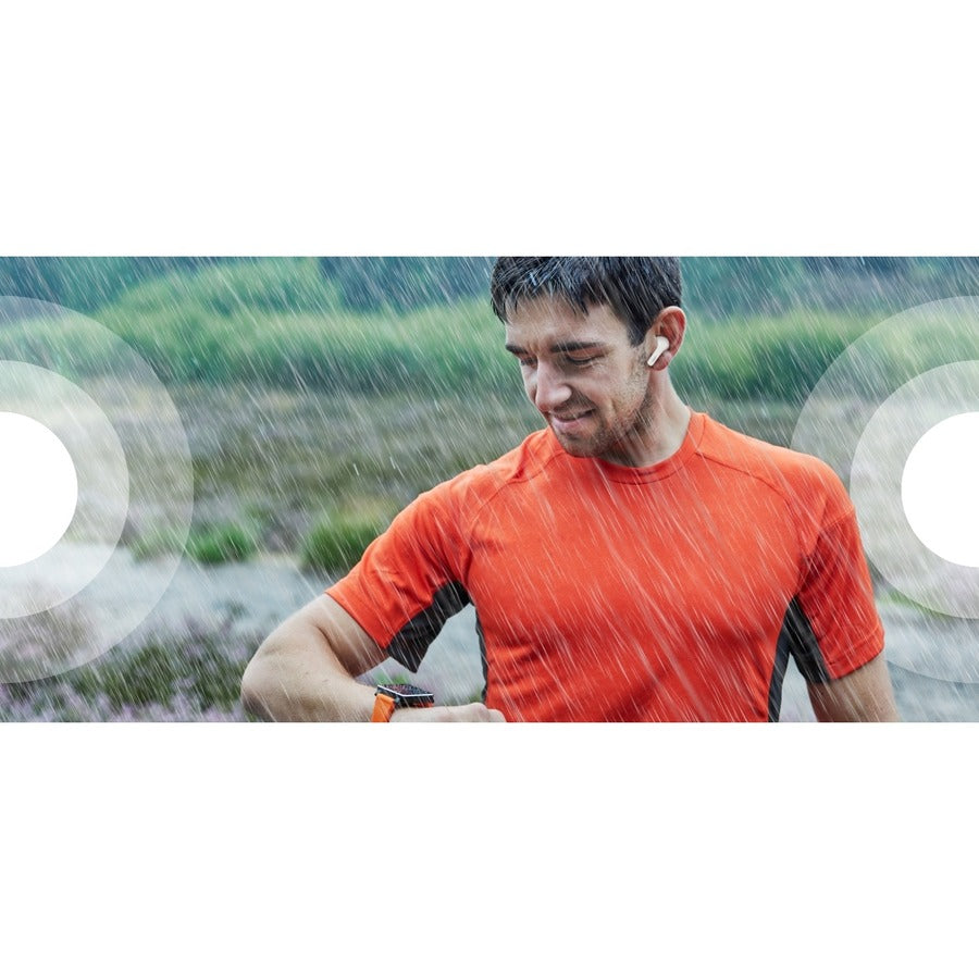 Keep listening through light rain and challenging workouts. IPX5-rated materials in each earbud have you covered.