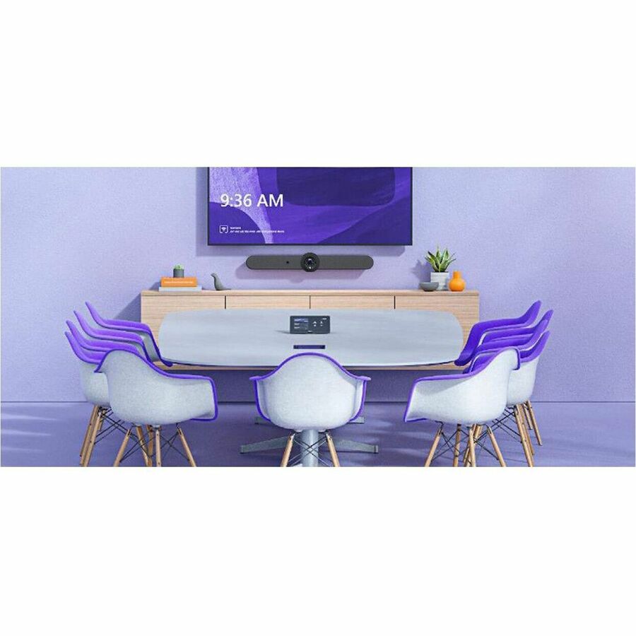 Rally Bar and the additional Mic Pod render clear, natural, conversational sound. Includes multiple beamforming elements to capture speech, with RightSound technology, simplified cabling, and elegant design.