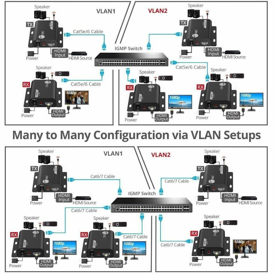 - Scalable, Flexible One-to-One or One-to-Many Setups Easily expand your video distribution using standard unmanaged Gigabit network switches to create One-to-Many Configuration. One transmitter can connect to up to 253 receivers (the additional receiver for Part# CE-H3IP01-S1 kit), ensuring a flexible and future-ready solution