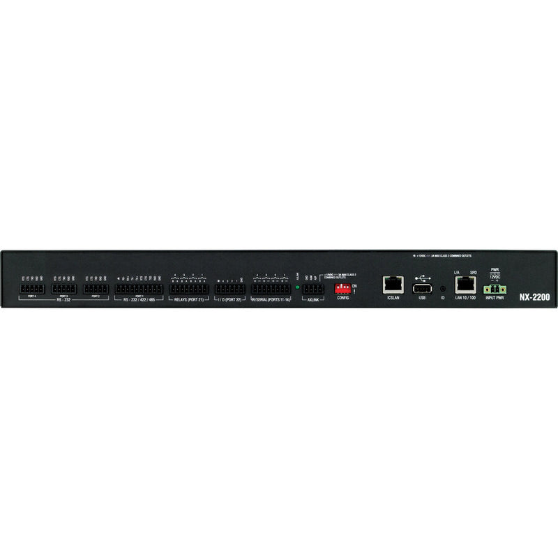 The NX-2200 / NetLinx® NX Integrated Controller is a programmable network appliance specifically designed to control AV and building technology using multiple analog and digital formats. The NX-2200 provides a scalable platform for the future by combining high performance, backward compatibility and extensive network security features. The NX-2200 is ideal for control and automation of medium-sized rooms and multi-room applications, as it includes more ports and security capabilities than the NX-1200.
