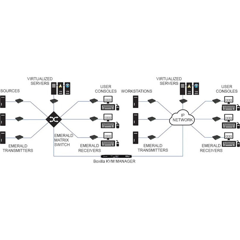 Emerald 4K Transmitters are infinitely scalable, starting as simple extenders, or part of a smaller switchable matrix over a network, or by adding a Boxilla on the network you can have a KVM over IP switchable system or hundreds or even thousands of devices providing access across locations.