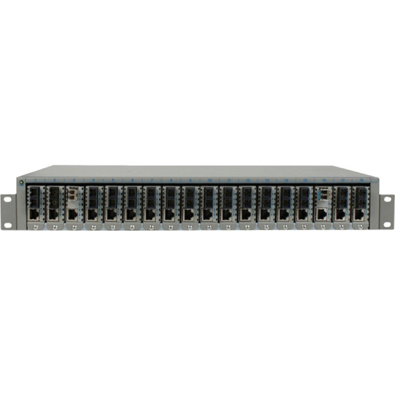 The chassis holds up to eighteen miConverter 10/100, 10/100 Plus, Gx and GX/T copper to fiber media converter modules with barrel-style DC connectors. It provides centralized power for all installed modules, and eliminates the need for individual power supplies. It is available with a single universal AC, 24VDC or 48VDC internal power supply.