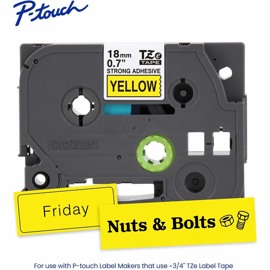 3/4" Black Print on Yellow Extra Strength label tape. Ideal for rough, textured, painted and other difficult to stick surfaces. 2 times stronger than standard adhesive. For P-touch Labelers using TZ or TZe tapes. Laminated. Black on Yellow.