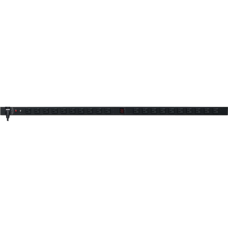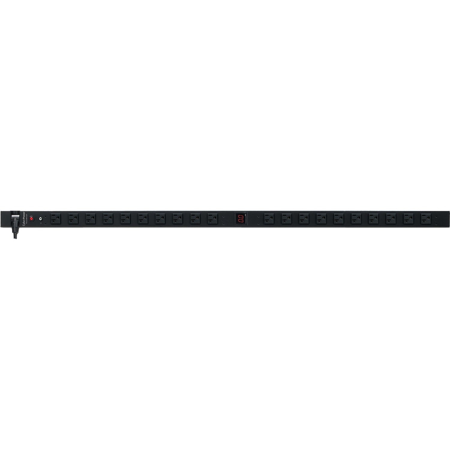 The CyberPower PDU20MV20F, a 20-outlet (front), 0U vertical rackmount metered power distribution unit (PDU), provides 100 - 125 V 20A output. It distributes power to 20 NEMA 5-20R receptacles from a single NEMA 5-20P plug with unfiltered electrical pass-through. The current draw for connected equipment is displayed in amps on the front LCD for real-time load monitoring.