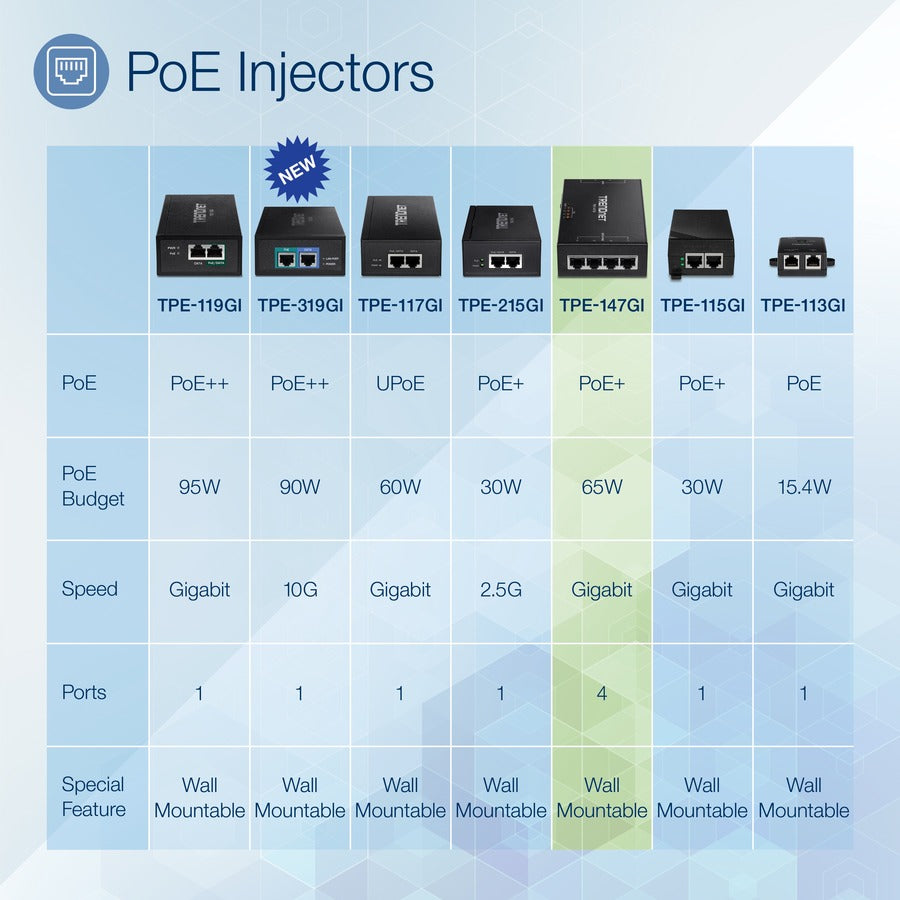 TRENDnet 65W 4-Port Gigabit PoE+ Injector, TPE-147GI, 4 x Gigabit Ports(Data in), 4 x gigabit PoE Ports(Data + PoE Out), Multi-Port PoE+ Injector up to 100m(328 ft.), Add PoE+ Power to Non-PoE Switch