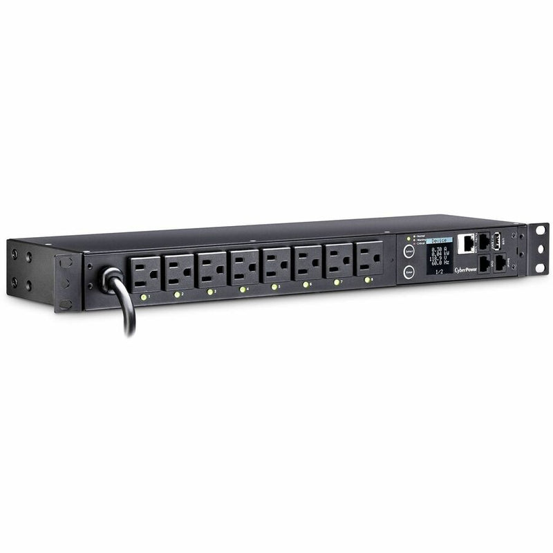 The CyberPower PDU41001, an 8-outlet (front), 1U rackmount switched power distribution unit (PDU), provides 120V 15A output. It distributes power to 8 NEMA 5-15R receptacles from a single NEMA 5-15 plug with unfiltered electrical pass-through. The switched outlet receptacles can be managed individually or collectively over the network, using the CyberPower Management Console, a web browser, and the RJ45 Ethernet port for network connection, or locally by using the LCD controls.