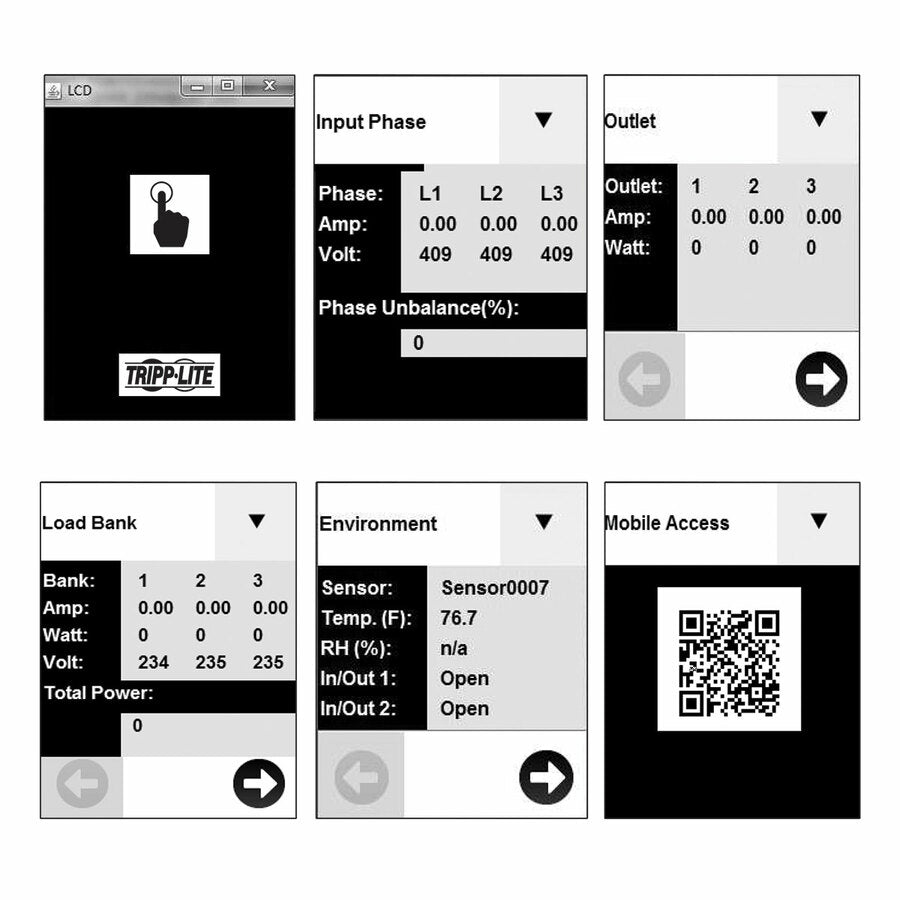 A color touchscreen LCD lets you toggle between menus to monitor input current level per phase, output current per load bank and per outlet with ±1% billing-grade accuracy, environmental sensor data and network information. It also generates a unique QR code to allow access to the switchable PDU through a mobile device.
