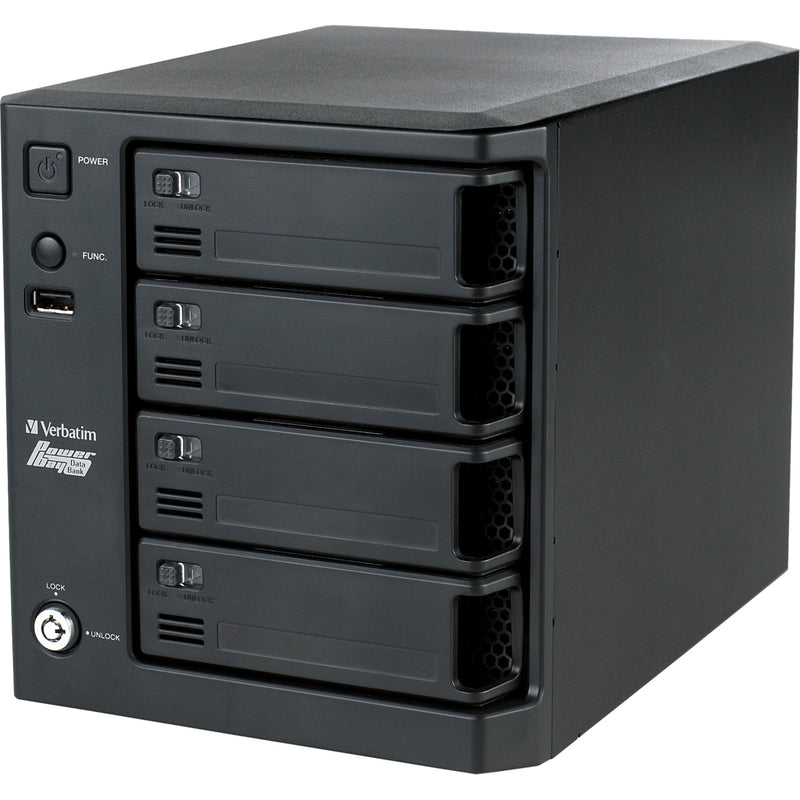 The Verbatim PowerBay Quad NAS system offers high performance with fast Gigabit Ethernet connections that centralize storage over a network. The PowerBay Quad NAS offers all of the advantages of the PowerBay family, plus unique features that further enhance data protection and security. In addition to RAID modes 0, 1+spare, 5 and 5+spare, the Quad NAS supports RAID 6 mode for even higher data security. RAID 6 technology allows data to be recovered even when a drive fails during the rebuilding process (two drive failure). NAS systems can be rebuilt automatically without physically replacing a cartridge in RAID modes where a spare drive is utilized. PowerBay NAS also supports 256 bit AES data encryption. The PowerBay Quad NAS system is simple to set up via a web-based interface and supports most major Network File and Service protocols. It supports scheduling of automatic backup of all computers on a network as well as many other storage management features including Active Directory support.