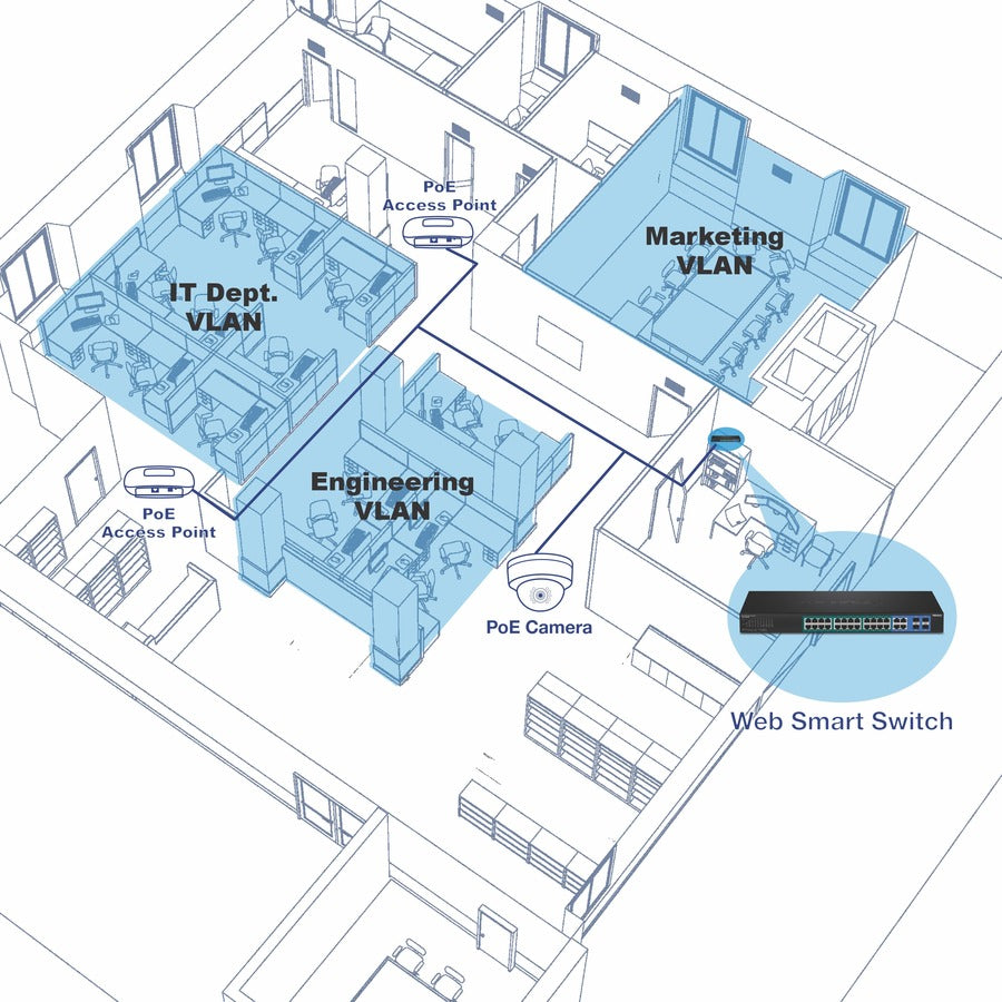 TRENDnet's Gigabit Web Smart PoE+ Switch series offers advanced L2+ features with enhanced traffic management controls to meet the evolving demands of SMB networks. This rack mountable IPv6-ready managed switch comes with an intuitive web-based interface. Advanced managed switch features include LACP to increase bandwidth between switches by grouping ports together, VLANs for segmenting and isolating virtual LAN groups, QoS for traffic prioritization, port bandwidth controls, and SNMP monitoring, making this a powerful solution for any SMB network. Improve voice performance by isolating and prioritizing VoIP traffic from normal data traffic with an easy-to-use voice VLAN feature.