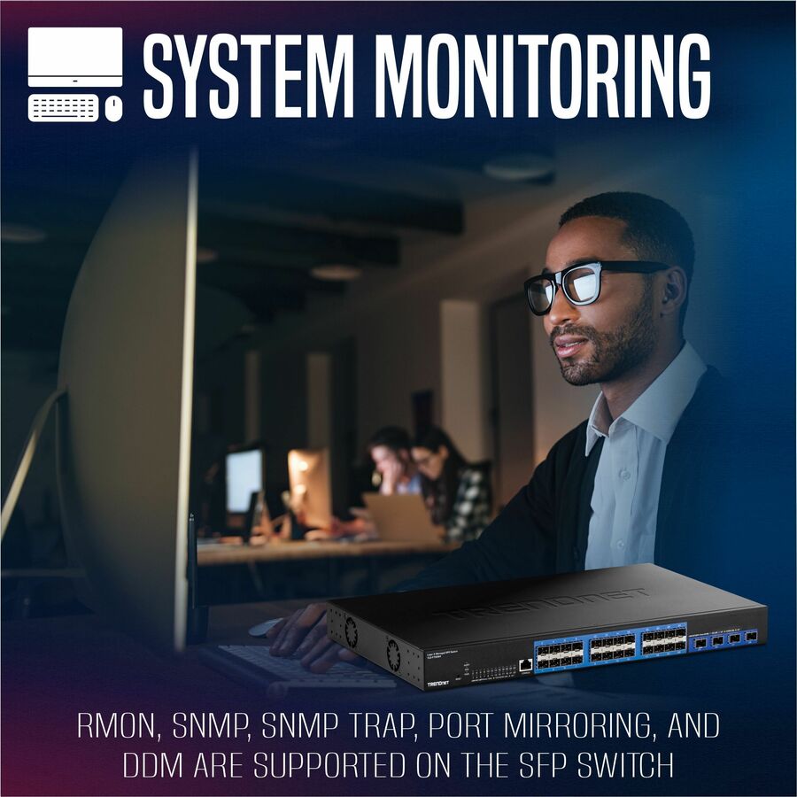 - Supports TRENDnet's RJ-45 copper and fiber SFP modules