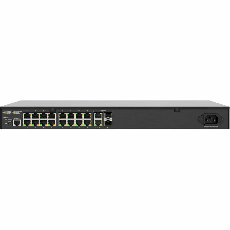 Use the SW-505-16P-R to provide 16 ports of network connectivity and PoE+ power in commercial or residential applications. This switch includes 20 total ports, 18 of which can be used at one time, with 16 Gigabit PoE+ Ethernet ports, 2 non-PoE Ethernet ports, and 2 - 1 Gbps SFP expansion ports which can be aggregated up to 2 Gbps.