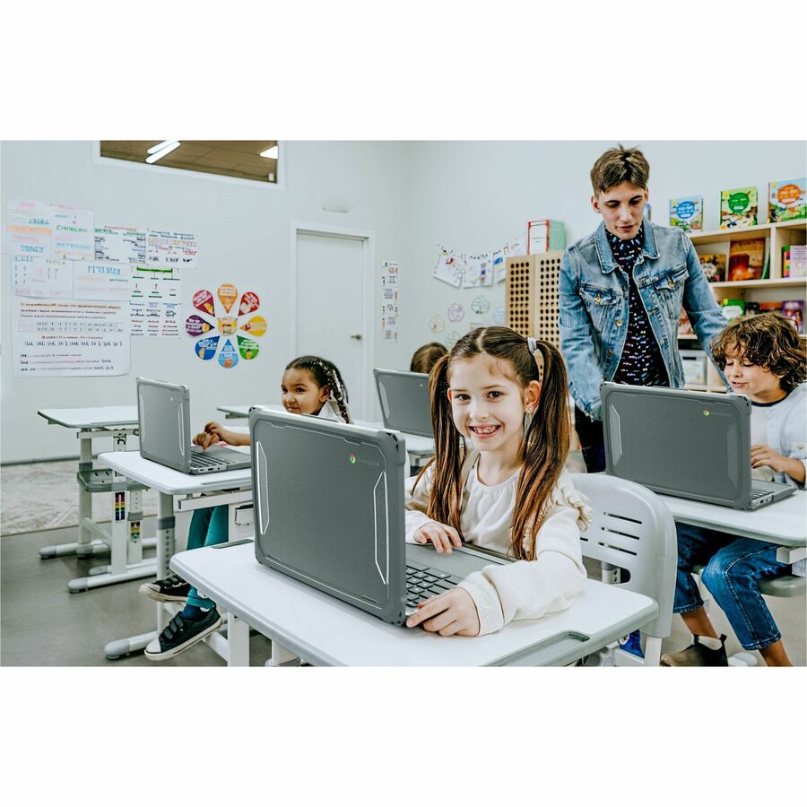 Featuring MAXCases' patented slide-on top design, the Extreme Shell-F Slide Case V3 protects Chromebooks with slide-on ease and enhanced screen protection in an updated, lighter-weight design. The slimmer top design further reduces carrying weight, without sacrificing durability or protection, while providing a sleek and easy-to-clean surface. The updated corners provide a slimmer profile designed to enhance protection under a wide range of impact circumstances. The innovative slide design disperses pressure evenly around the entire top perimeter, for a snug fit that eliminates pressure hotspots around the screen. Crafted with dual layers of tough TPU for outstanding impact and drop protection, the ESF3 case combines a cushioning inner layer with an oil- and dirt-resistant outer layer and is tested to meet MIL-STD 810G-516.6 for four-foot drops. The clear, rigid top and bottom panels prevent exterior damage and provide visibility for stickers and asset tags. The custom fit ensures easy access to all buttons and ports. For added convenience, the V3 design accommodates a handy carrying strap that fits snuggly against the case (sold separately).