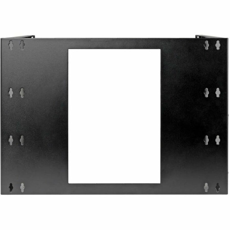 Rear keyhole mounting slots are 16 inches apart to align with standard wall-stud placement. Stamped horizontal reinforcement ribs on the back of the bracket provided extra stability. The 8U wall-mount bracket comes with mounting screws for installing the bracket and rack equipment.