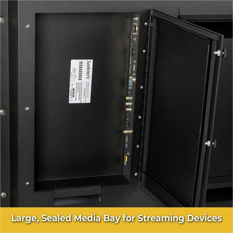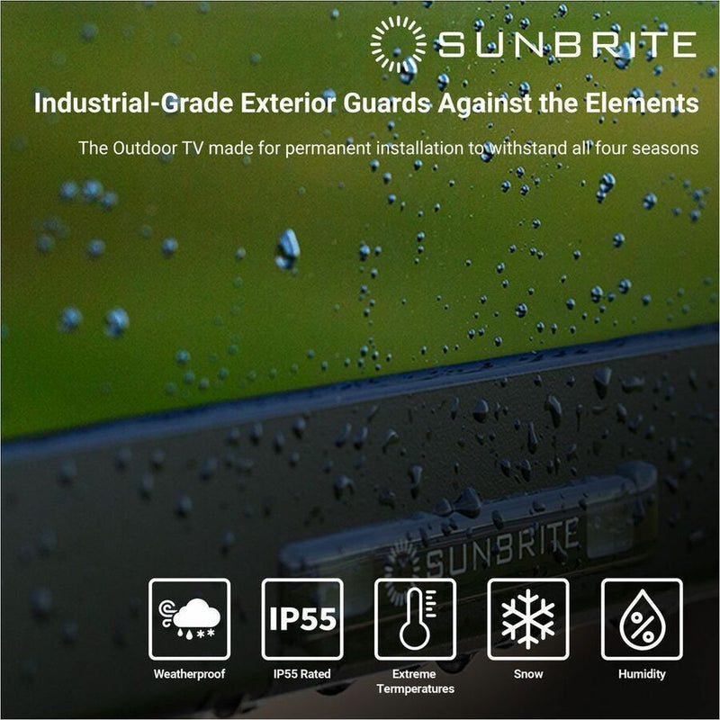 For the ultimate outdoor entertainment experience, look no further than theSunBriteTV Pro 2 Series fully-weatherproof outdoor TV. Bring the fun outside! Featuring a sleek Full HD display, the Pro 2 lets you safely bring the fun outdoors. With its TruVision anti-glare display, you get a brilliant picture that's perfectly viewable in direct sunlight at multiple angles. The powder-coated frame resists rust and corrosion while protecting the internal components from everything from rain and salty air to pesky insects. And to eliminate condensation, the internal heating and cooling system regulates running temperature, so you can enjoy the big game in extreme high and low temperatures. And feel free to put the Pro 2 in the middle of the action! Its tempered glass shield helps protect the screen, making it perfect for high-traffic active areas. Plus, never miss a movie night with the weatherproof media bay, which uses thick gaskets and a weatherproof cable entry system to protect many popular set-top boxes, gaming systems and streaming media players.