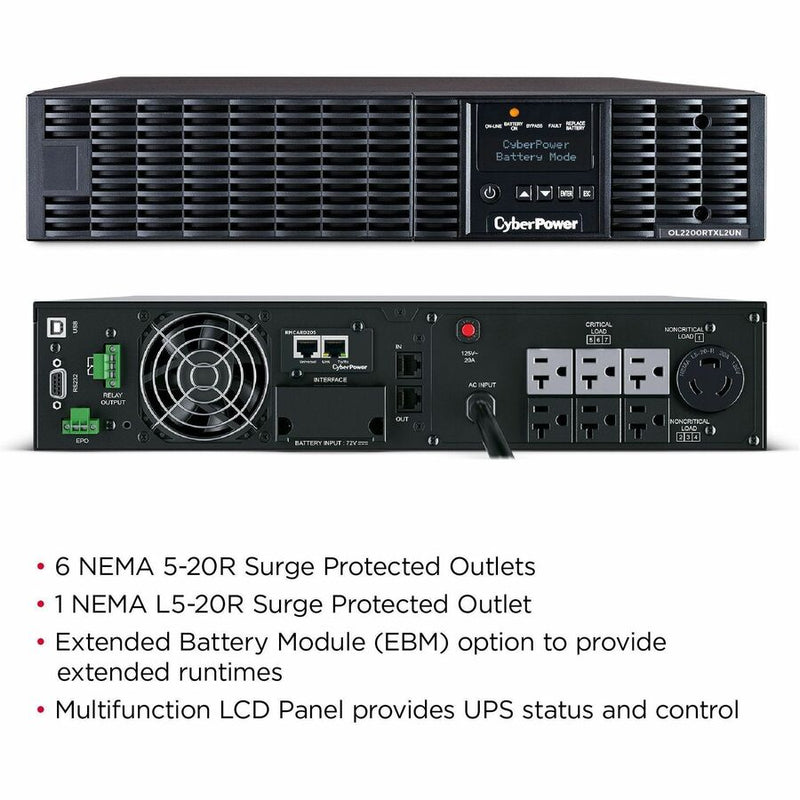 The CyberPower OL2200RTXL2UN is a rack/tower UPS with double conversion topology. It provides sine wave output to critical applications and equipment that require seamless power correction. The Extended Battery Module (EBM) expands runtime, and Fast Charge Technology restores full backup power faster. This model comes with an extendable LCD control panel, Smart Battery Management charging technology, and energy-saving GreenPower UPS™ ECO Mode.