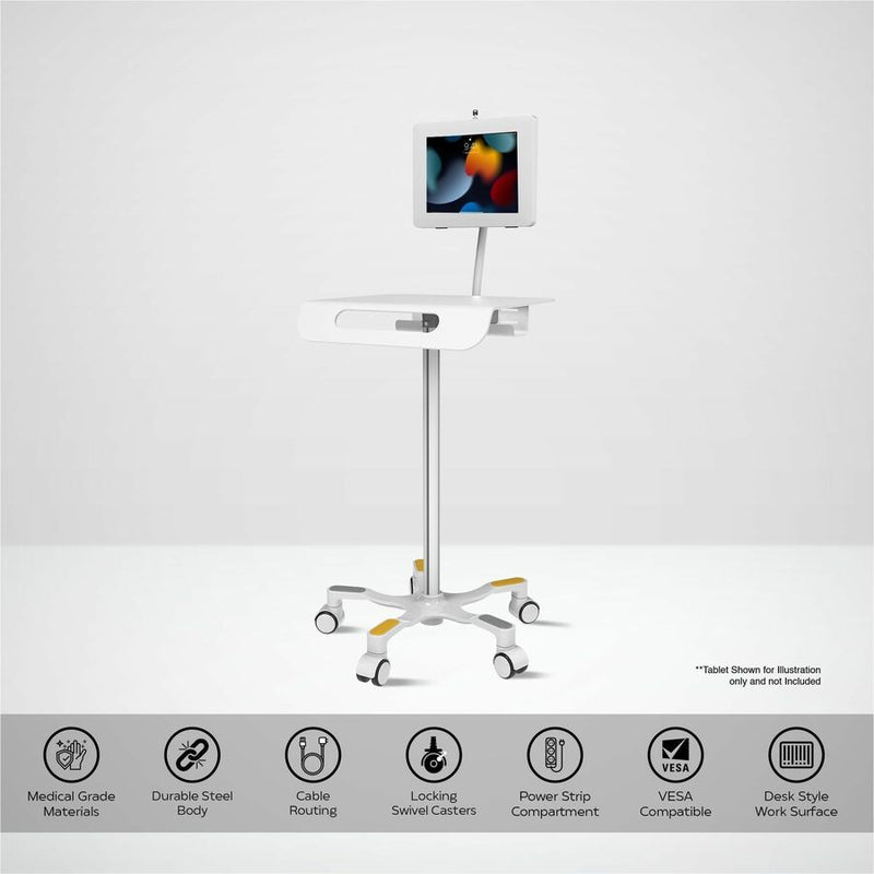 Der Arm des Gehäuseständers ist am Ende einer geräumigen Arbeitsfläche befestigt und bietet Platz für Tastatur, Netzteil oder anderes Zubehör. Ein spezielles Fach für die Steckdosenleiste darunter sorgt dafür, dass Ihre Ladekabel angeschlossen und nicht sichtbar bleiben. Ausgestattet mit einem Griff an der Vorderseite und leichtgängigen, robusten Lenkrollen mit Feststellfunktion lässt sich dieser medizinische Wagen überall hin mitnehmen, wo Sie und Ihre Patienten sein müssen.