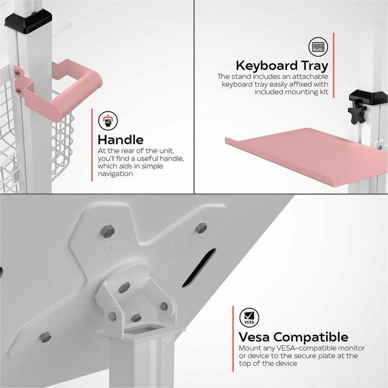 Ob Sie einen stabilen, multifunktionalen Bodenständer für das Gesundheitswesen, den Einzelhandel, das Gastgewerbe oder Veranstaltungen benötigen – der mobile Bodenständer von CTA bietet alles, was Sie brauchen. Im Lieferumfang enthalten ist unser meistverkauftes Paragon Premium Locking Enclosure (PAD-PARAW), das eine sichere, geneigte Tablet-Halterung mit ausreichend Platz darunter bietet, um Peripheriegeräte wie Powerbanks oder USB-Hubs sicher zu verstauen. Der stabile Standfuß besteht aus fünf leichtgängigen, arretierbaren Rollen. Der Ständer umfasst eine anbringbare Tastaturablage und einen praktischen Korb, die sich mit dem mitgelieferten Montagesatz einfach befestigen lassen. An der Rückseite des Ständers befindet sich ein praktischer Griff für einfaches Navigieren. Zwei Halterungen am Standfuß bieten eine sichere Kabelführung. Mit einem Einstellknopf lässt sich die Höhe der Tablet-Halterung bequem für jeden Benutzer einstellen.