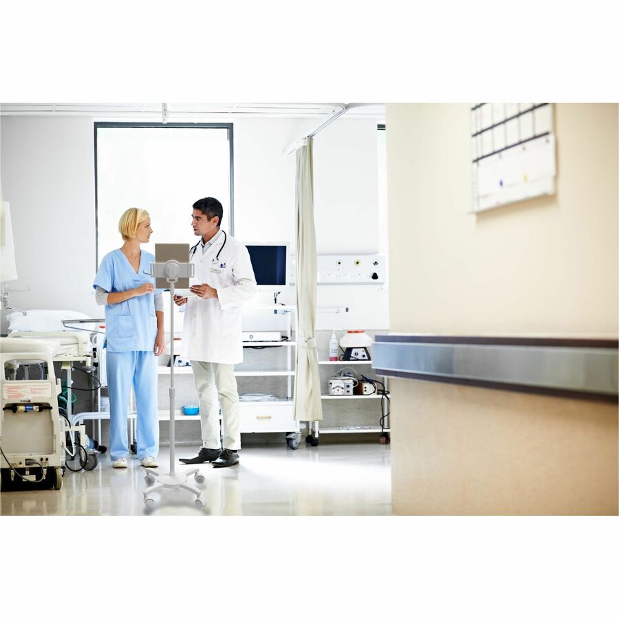 Dieser schlanke und robuste Bodenständer ermöglicht eine schnelle und einfache Einrichtung in jeder Geschäfts- oder Wohnumgebung. Der zentrale Standfuß ist mit vier feststellbaren Rollen in Industriequalität ausgestattet und eignet sich ideal für Krankenhäuser und Arztpraxen. Dank omnidirektionaler Winkel- und Höhenverstellung sowie 360-Grad-Drehung lässt sich der Tablet-Halter um 360 Grad drehen und ermöglicht so die Verwendung im Hoch- und Querformat.