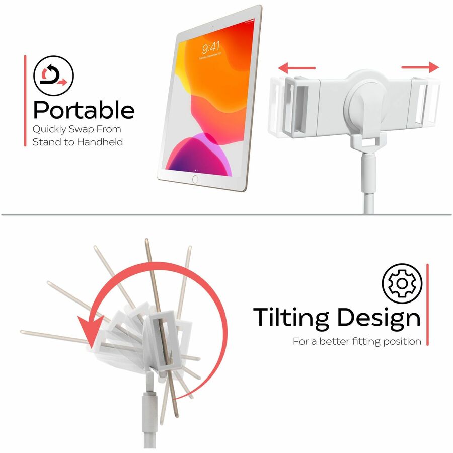 Der Schnellverschlussmechanismus löst die Tablet-Halterung durch einfaches Drücken vom Ständer. So können Sie zwischen Hand- und Standmodus wechseln, ohne Ihr Tablet aus der Halterung oder dem Standfuß nehmen zu müssen. Die größenverstellbare Halterung und die zusätzlichen Pads ermöglichen uneingeschränkten Zugriff auf Ihre Tablets, Anschlüsse, Tasten und Buchsen und sind für nahezu jedes Tablet-Modell geeignet.
