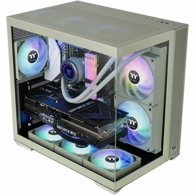 Erleben Sie die ultimative PC-Anpassung mit dem View 380 TG ARGB Mid-Tower-Gehäuse. Dieses innovative Zweikammer-ATX-Gehäuse ist für die nahtlose Integration mit Hidden-Connector-Motherboards von ASUS und MSI konzipiert. Es verfügt über vier beeindruckende 120-mm-ARGB-Lite-Lüfter mit Hydrauliklager, die Ihr System mit lebendiger, anpassbarer Beleuchtung beleuchten und vollständig mit Software von ASUS, GIGABYTE, MSI und ASRock kompatibel sind. Beim View 380 TG ARGB geht es nicht nur um Ästhetik, es bietet auch beispiellose Flexibilität für Kühllösungen. Bringen Sie bis zu zehn 120-mm-Lüfter unter und installieren Sie oben einen bis zu 360-mm-Radiator und auf der rechten Seite einen 280-mm- oder 240-mm-Radiator. Bauen Sie Ihren Traum-PC mit der Freiheit, Luftstrom und Kühlung genau nach Ihren Wünschen zu optimieren. Verwandeln Sie Ihr Setup mit dem View 380 TG ARGB Mid-Tower-Gehäuse, bei dem Leistung auf spektakuläres Design trifft.