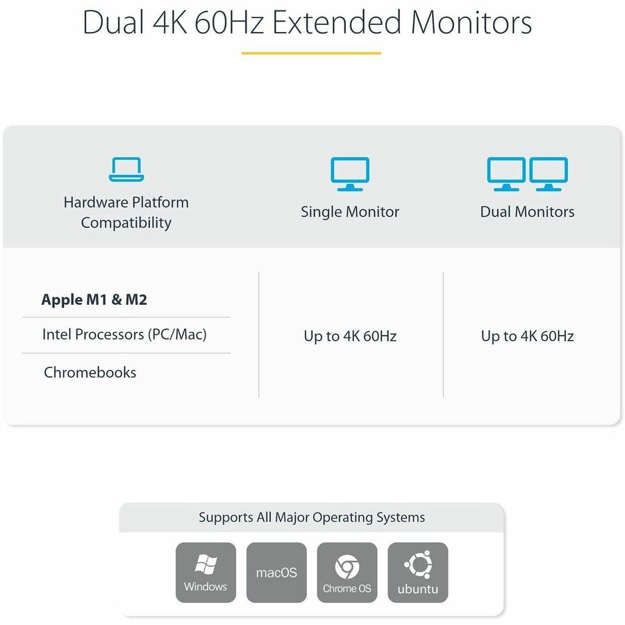 Das Dock ist DisplayLink-zertifiziert und bietet Plug-and-Display-Kompatibilität mit Windows, ChromeOS und macOS. Dies ermöglicht den Betrieb und Wechsel zwischen mehreren Computern mit unterschiedlichen Betriebssystemen. Die DisplayLink-Technologie unterstützt außerdem erweiterte Dual-Displays auf Apple MacBooks der M-Serie, die standardmäßig nicht mehr als ein externes Display ansteuern können. Die DisplayLink-Zertifizierung gewährleistet Auflösungen von bis zu 4K bei 60 Hz auf beiden externen Displays.
