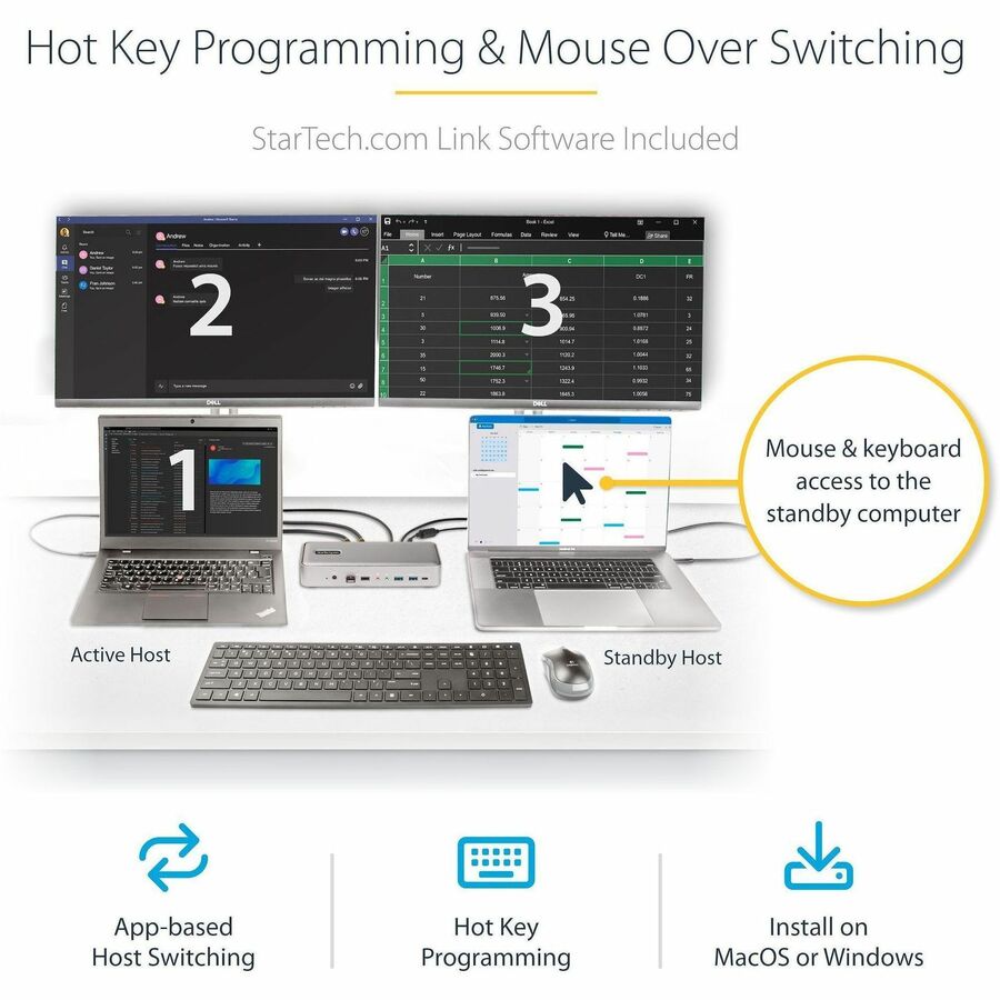 Docken und wechseln Sie zwischen zwei Laptops, um auf die Peripheriegeräte Ihrer Workstation, einschließlich zwei Monitoren, zuzugreifen und nahtlos per Knopfdruck zwischen Laptops zu wechseln. Die herunterladbare Hot-Key-Software (verfügbar für Windows und macOS) ermöglicht Benutzern das Wechseln zwischen Computern per Tastenkombination.