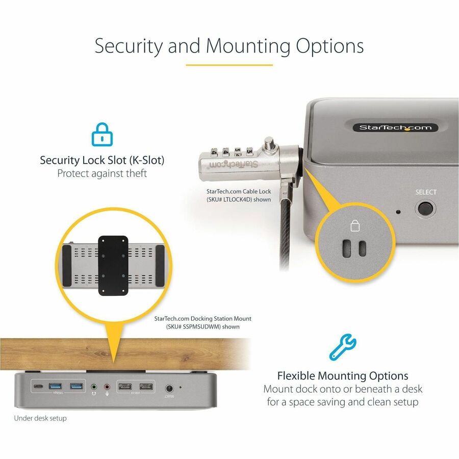 Das Dock verfügt über ein Montagemuster und kann daher in Kombination mit StarTech.com-Montagezubehör (separat erhältlich) montiert werden. Unser Montagezubehör ermöglicht die Montage am VESA-Muster auf der Rückseite eines Monitors oder auf jeder ebenen Oberfläche. Die folgenden Halterungen sind mit diesem Produkt kompatibel: