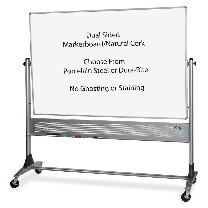 Die wendbare Tafel eignet sich für Präsentationen, Meetings und Schulungen und bietet die doppelte Schreib- oder Heftfläche einer herkömmlichen Wandtafel. Die Oberfläche lässt sich um 360 Grad drehen und lässt sich per Knopfdruck arretieren. Die Tafel hat eine magnetische Porzellanoberfläche auf der einen Seite, Naturkork auf der anderen und eine eloxierte Aluminiumverkleidung. Die breite Basis sorgt für Stabilität und verfügt über 7,6 cm lange Feststellrollen für Mobilität.
