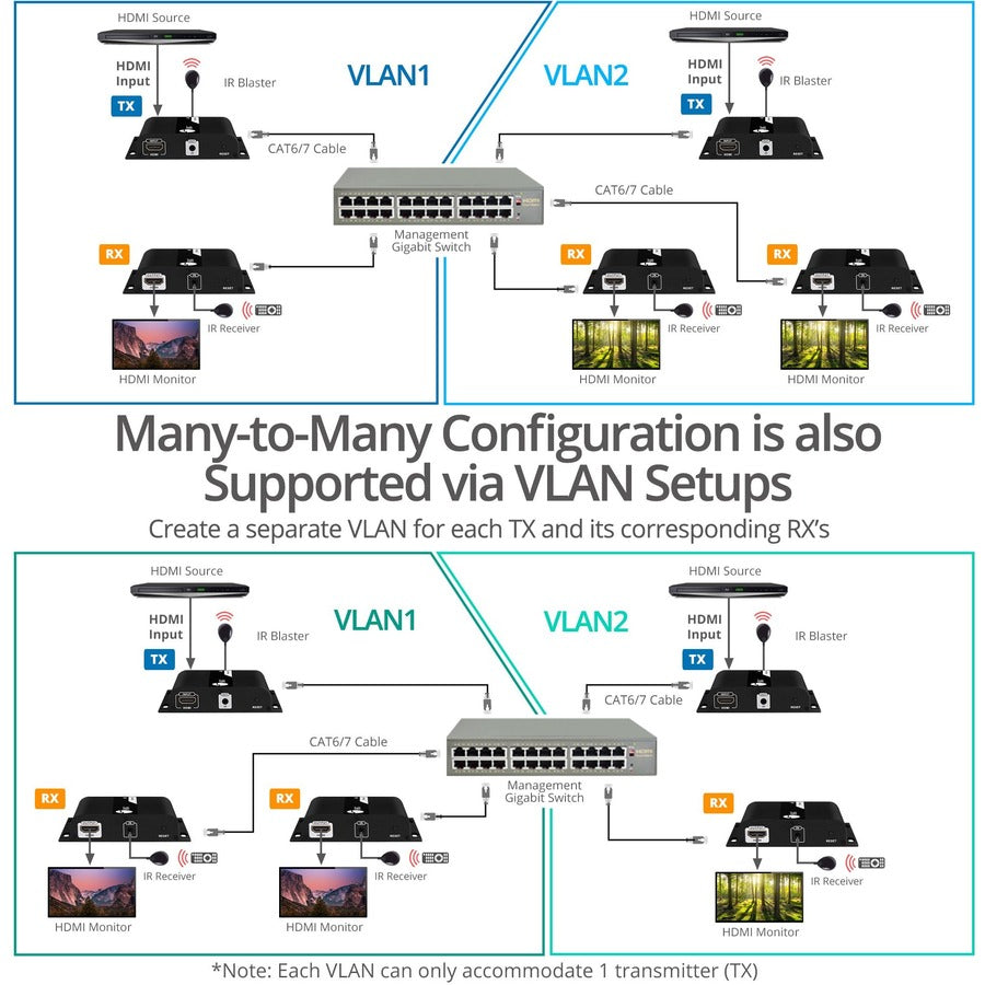 - Direkte 1-zu-1-Verbindung, 1-zu-viele über nicht verwaltete Gigabit-Netzwerk-Switche oder viele-zu-viele über VLAN über einen Smart Ethernet Switch. Mit dem HDBitT-Transportprotokoll können Sie bis zu 255 Empfänger* pro Sender anschließen, um HDMI-Signale nicht nur zu verlängern, sondern auch auf mehrere Displays aufzuteilen. *Zusätzliche Empfänger (CE-H25E11-S2) sind separat erhältlich.