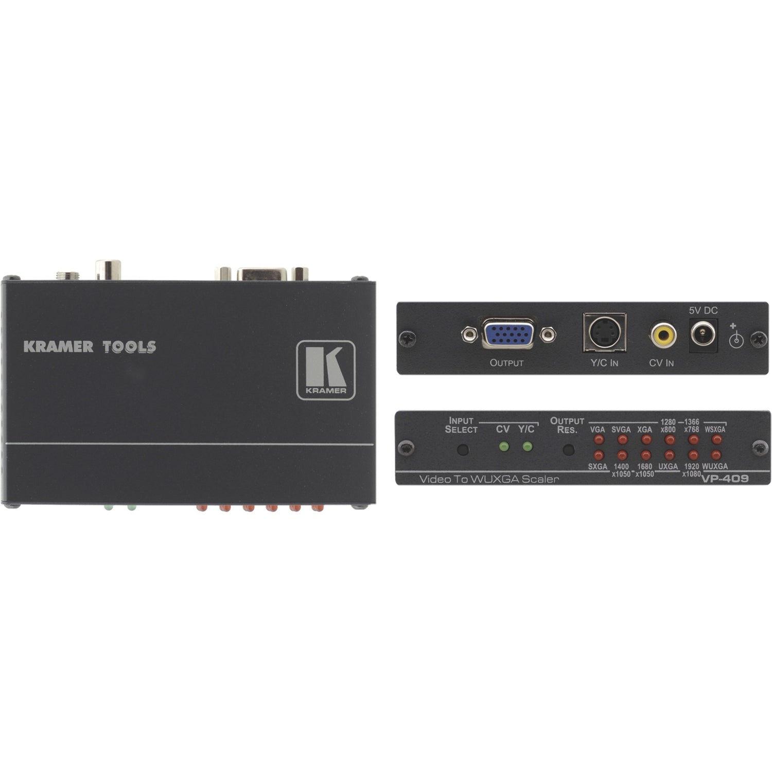 Der VP-409 ist ein hochwertiger Video-Scaler für Composite- und S-Video-Signale (Y/C). Das Gerät skaliert das Videosignal auf ein wählbares Computergrafik-Videoausgangssignal über einen 15-poligen HD-Anschluss.