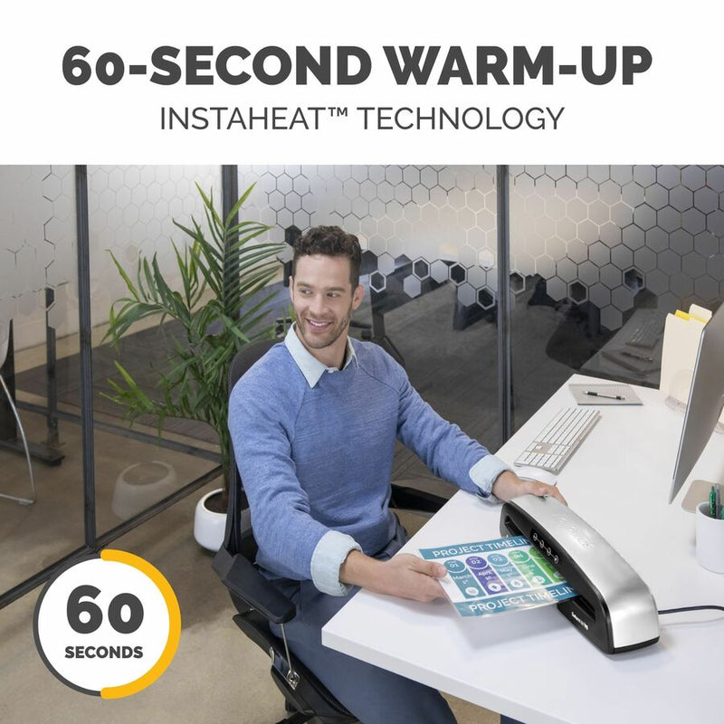Das Laminiergerät bietet dank InstaHeat-Technologie eine schnelle Aufwärmphase von nur einer Minute. Die 24 cm breite Einschubbreite eignet sich für verschiedene Dokumentgrößen. Das Saturn3i 95 Laminiergerät bietet Heißlaminierung für 3 mm oder 5 mm und Kaltlaminierung für selbstklebende Folien. Es laminiert 30 cm pro Minute und sorgt so für ein schnelles Ergebnis. Grünes Licht und ein Signalton zeigen an, wann das Gerät laminieren kann. Der Entriegelungshebel löst die Folie zum erneuten Zentrieren oder Entnehmen. Die automatische Abschaltung spart Energie und verhindert Überhitzung. Ein Laminier-Starter-Kit ist im Lieferumfang enthalten.