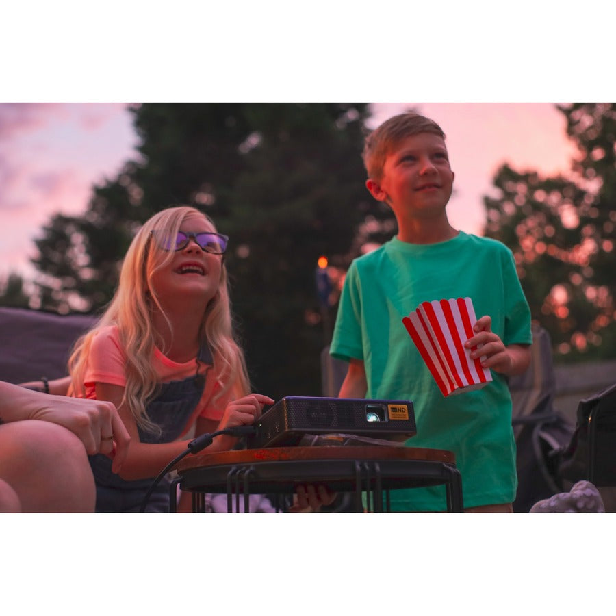 Der AAXA M7 ist ein tragbarer Projektor für Großbildprojektionen. Er eignet sich perfekt für Freiluftkinoabende wie z. B. im Garten. Er verfügt über einen integrierten Akku mit 3 Stunden Laufzeit, zwei Premium-Lautsprecher, eine ultrahelle LED-Lichtquelle mit 30.000 Stunden Laufzeit und eine elektrische Fokuseinstellung.