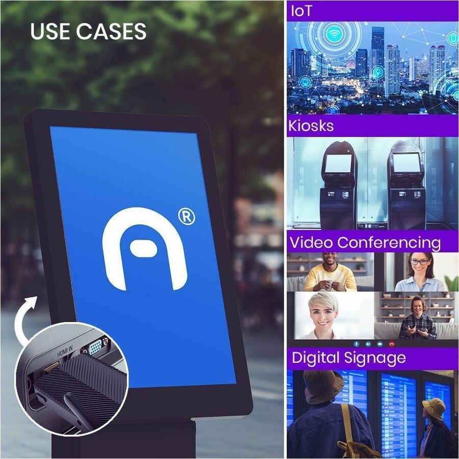The Access Pro Mini PC Stick with Windows 11 Pro is a compact, fanless device designed for enterprise applications. Powered by a 3.4 GHz Intel N100 Quad-Core processor, it features 4GB LPDDR4 RAM, 64GB eMMC storage, and Intel UHD Graphics. Connectivity options include USB-A 3.0, USB-C 3.0, HDMI 2.0 supporting 4K@60FPS, Gigabit Ethernet, Wi-Fi 6, Bluetooth 5.2, a microSD card slot, and a 3.5mm audio jack. Its plug-and-play design allows direct connection to displays, making it ideal for digital signage, IoT deployments, and video conferencing.