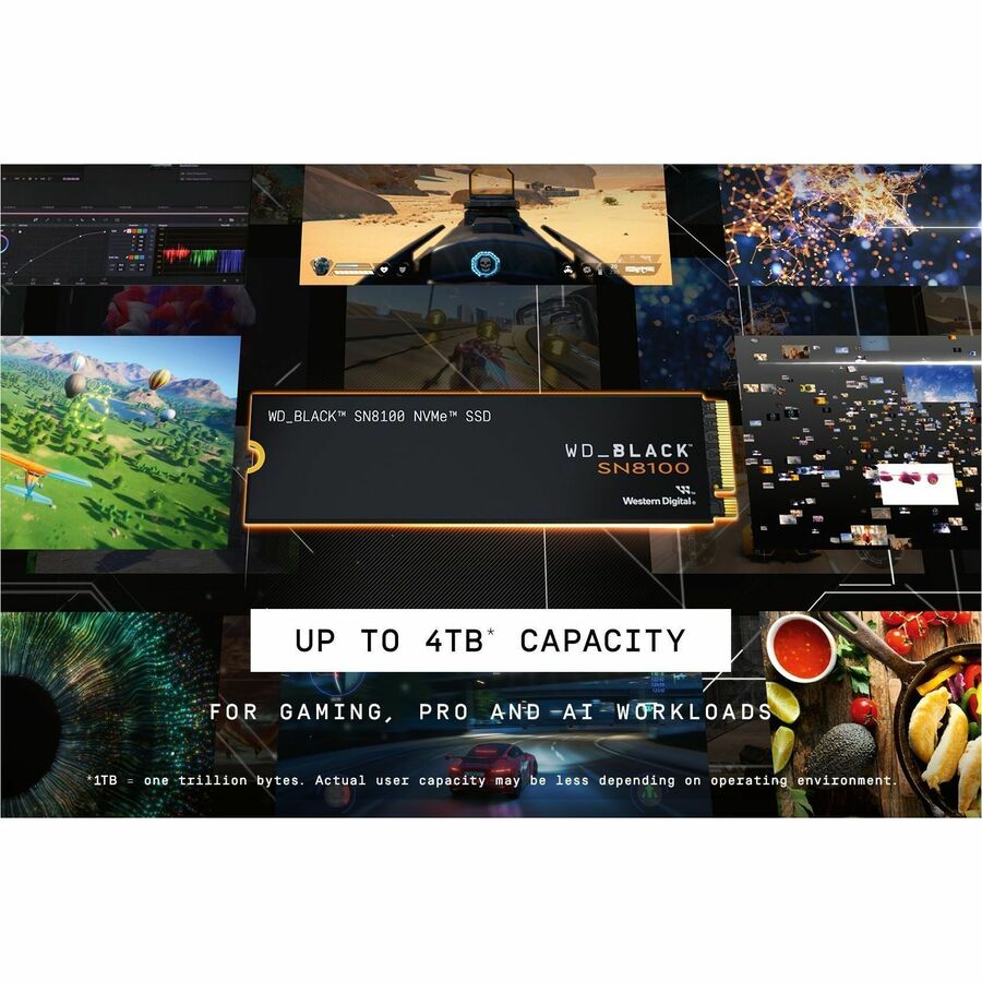 Build your new gaming or workstation system with our cutting-edge PCIe® Gen 5 SSD, delivering blistering speeds up to 14,900 MB/s1 for demanding tasks like high-level gaming, professional content creation, and AI applications. As an industryleader for PCIe® Gen 5 power efficiency, the WD_BLACK™ SN8100 NVMe™ SSD harnesses advanced TLC 3D CBA NAND technology to help ensure performance and reliability, while a low-power profile and optimized thermal performance keep your system cool and running smoothly. With up to 4TB2 of storage and a suite of powerful features, this SSD is the ultimate upgrade for discerning users.