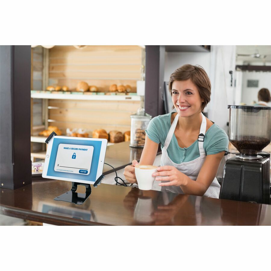 Der anbringbare Metallständer bietet Stabilität und kann durch vorgebohrte Löcher für eine einfache Installation und zusätzliche Sicherheit an einem Schreibtisch oder einer Arbeitsplatte befestigt werden. Der angebrachte Halter lässt sich neigen, um Transaktionen schnell von vorne nach hinten zu verstellen, den Betrachtungswinkel anzupassen oder für horizontale oder vertikale Betrachtung zu drehen. Dank des perfekten Designs für die Nutzung größerer Tablets als Arbeitsstation, Verkaufsdisplay oder Kassensystem bietet Ihnen der verstellbare Diebstahlschutzgriff und -ständer von CTA für iPad Pro und große Tablets (9,7 bis 14 Zoll) Komfort und Sicherheit.