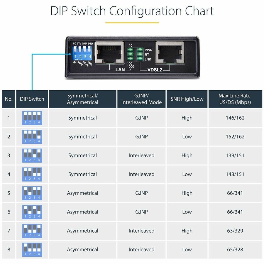 Erweitern Sie ein Netzwerk über VDSL2 mit UTP/CAT5e/CAT6/RJ11-Kabeln auf bis zu 1 km; Ethernet Extender unterstützt bis zu 300 Mbit/s (aggregiert) – Einstellungen per DIP-Schalter wählbar (8 Profilkonfigurationen verfügbar) – LEDs für Netzwerkstatus, einschließlich LAN-Geschwindigkeit/Verbindungsstatus/Strom/Remote- oder Master-Modus – Wandmontage-Hardware und zwei Netzteile im Lieferumfang enthalten – Funktioniert mit VDSL2-IP-DSLAMs von Drittanbietern im Remote-Modus; 802.1Q VLAN-Tag-Transparenz bewahrt VLAN-getaggten Verkehr über die Erweiterung