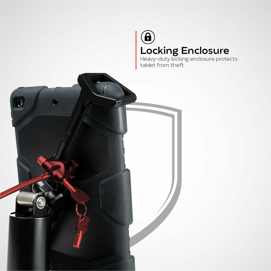 Las dos palabras que mejor describen este producto son "seguro" y "robusto". El soporte de seguridad resistente protege su dispositivo del desgaste, mientras que el práctico cierre evita robos. Con el soporte hueco, puede pasar todos los cables del dispositivo de forma invisible directamente a través del mismo, creando una apariencia limpia y profesional. Dos giros de 360 grados, uno en la base y otro en el soporte, hacen que este soporte para quiosco sea perfecto para transacciones personalizadas en el punto de venta. Para mayor seguridad, puede usar el cable de bloqueo de acero irrompible incluido para asegurar su dispositivo: un extremo se fija directamente al soporte y el otro a cualquier dispositivo cercano.
