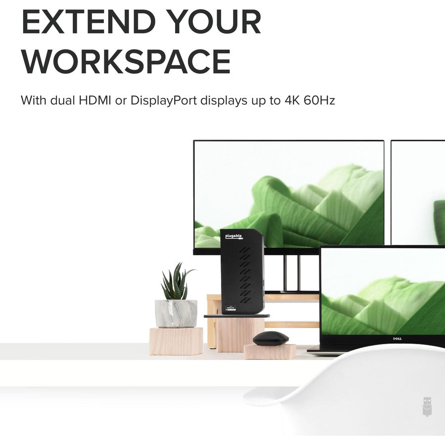 Con el último chipset DisplayLink DL-6950, la estación de acoplamiento Plugable UD-6950Z permite conectar dos monitores externos con una resolución de hasta 4K a 60 Hz mediante DisplayPort o HDMI a su portátil o computadora de escritorio Windows mediante USB 3.0. Además, la estación de acoplamiento UD-6950Z permite conectar hasta ocho accesorios a sus seis puertos USB 3.0, una conexión Gigabit Ethernet y un puerto de entrada/salida de audio, todo con un solo cable USB.