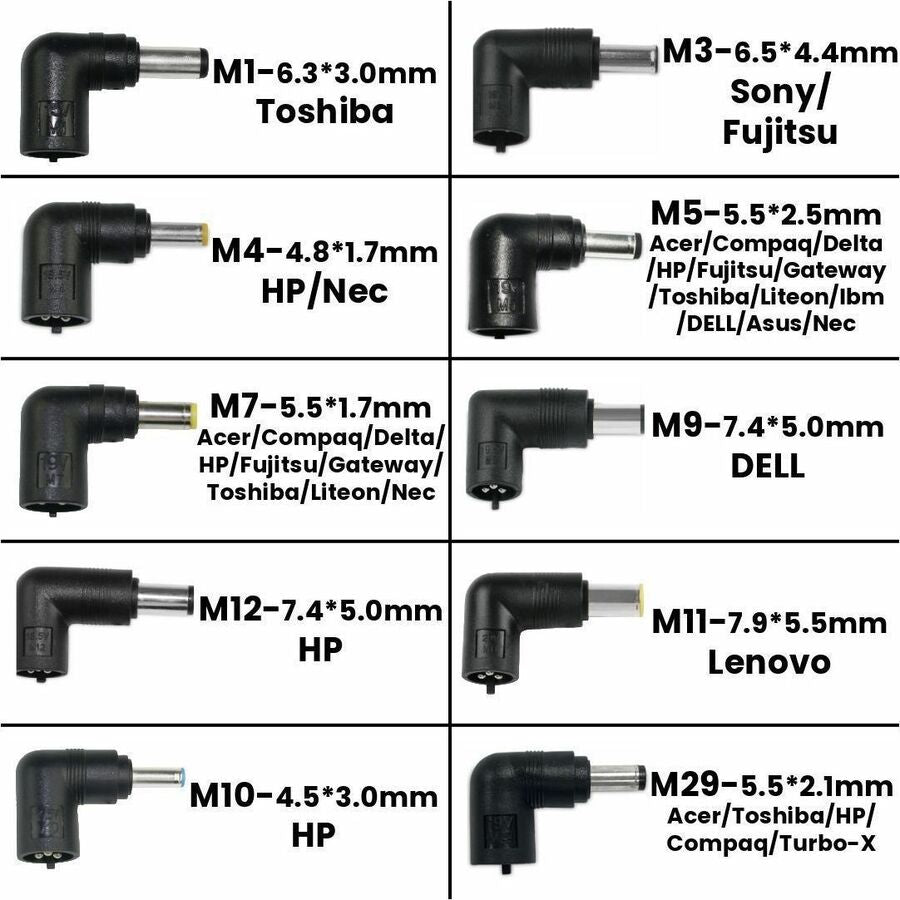• Incluye los siguientes conectores de barril para computadora portátil: M1: 6,3 x 3,0 mm, M3: 6,5 x 4,4 mm, M4: 4,8 x 1,7 mm, M5: 5,5 x 2,5 mm, M7: 5,5 x 1,7 mm, M9: 7,4 x 5,0 mm (DELL), M12: 7,4 x 5,0 mm (HP), M11: 7,9 x 5,5 mm, M10: 4,5 x 3,0 mm (HP), M29: 5,5 x 2,1 mm