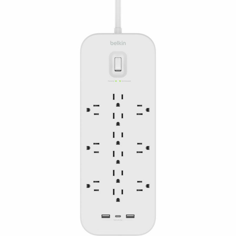 Regleta de enchufes Belkin con 12 tomas de CA, 1 puerto USB-C y 2 puertos USB-A, cable de 1,8 m, protección contra sobrecargas y sobretensiones, e interruptor de encendido/apagado (4000 julios de protección).