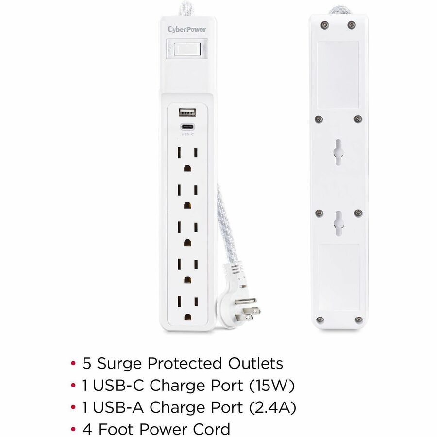 The CyberPower Surge Protector P504UC prevents spikes in energy caused by storms and electrical power surges from reaching your home electronics such as audio/video equipment, laptops and desk top computers, household appliances and small electronics. The P504UC provides 500 joules of surge protection, 5 AC outlets, 1 USB-C charging port, 1 USB-A charging port, and a braided 4 foot power cord with a right-angle plug.